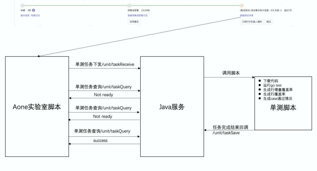 当开发在预集成环境提交代码、部署完成之后,流程自动运行单测实验室。单测实验室里的脚本,先调用任务下发接口/unit/taskReceive,这时Java服务会调用对应的单测脚本。