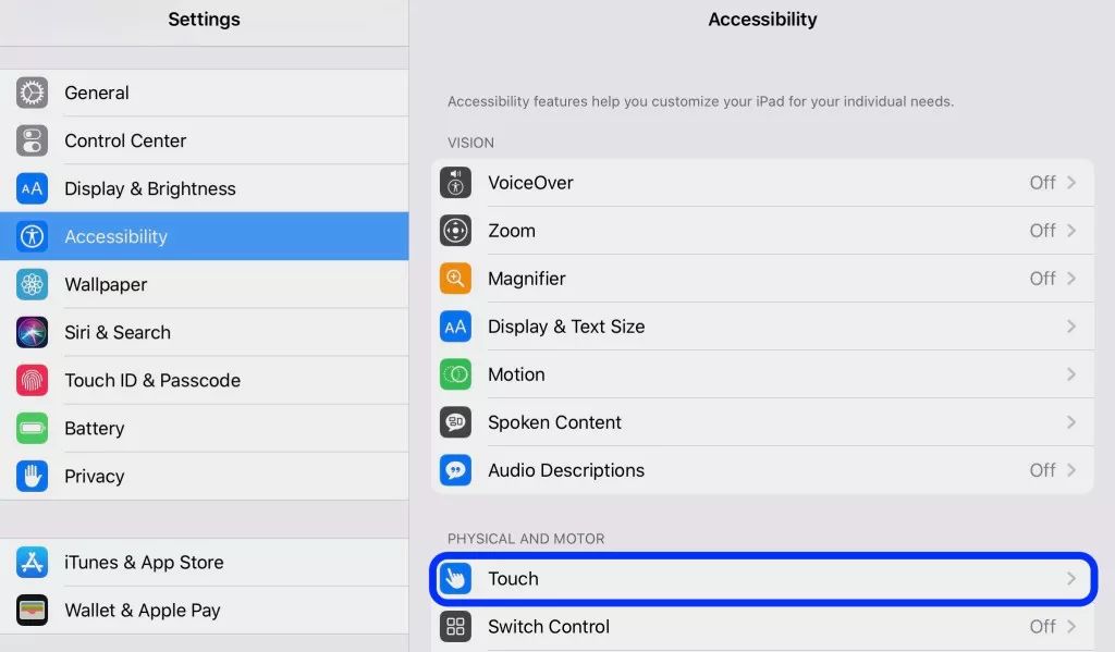 - 点击「触控」设置里的辅助触控开关将其开启;