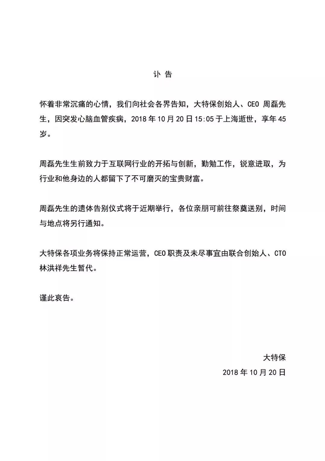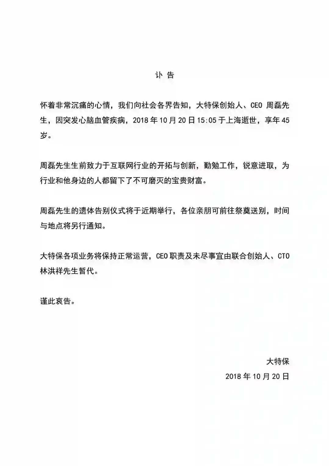 2018年10月20日,深秋的午后,45岁的周磊走了。从创业一开始就陪伴他的大特保CTO林洪祥在朋友圈写下了这一消息。