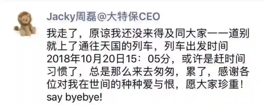 今天晚间,大特保CEO周磊的朋友圈,出现了一条动态,他说:我走了,原谅我还没来得及同大家一一道别。