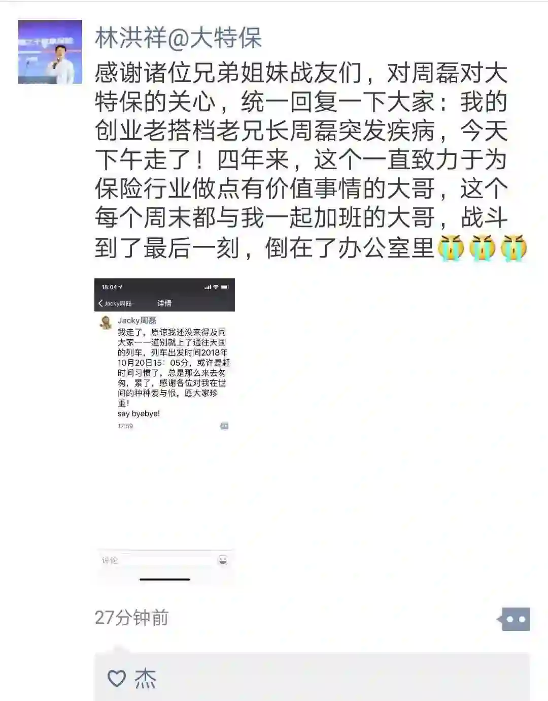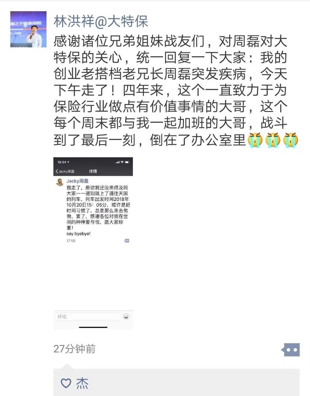 这条朋友圈动态,疑是周磊先生家人所发,邦哥朋友圈众多创业者纷纷转发了相关截图,悼念这位创业者。大特保公司也在第一时间发布了讣告: