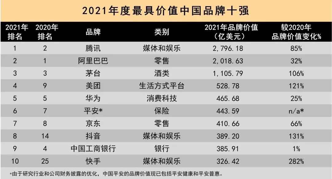 今日,凯度发布 2021 年最具价值中国品牌 100 强排行榜,最具价值的 100 个中国品牌总价值同比增长 57%,达到 1.56 万亿美元。腾讯升至百强榜首,品牌价值同比增长 85%,达到 2796 亿美元;阿里巴巴(2019 亿美元)和茅台(1106 亿美元)排名第二和第三名,今年是该榜单的第 11 次发布。