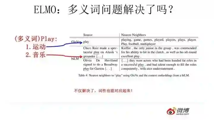 前面我们提到静态Word Embedding无法解决多义词的问题,那么ELMO引入上下文动态调整单词的embedding后多义词问题解决了吗?解决了,而且比我们期待的解决得还要好。上图给了个例子,对于Glove训练出的Word Embedding来说,多义词比如play,根据它的embedding找出的最接近的其它单词大多数集中在体育领域,这很明显是因为训练数据中包含play的句子中体育领域的数量明显占优导致;而使用ELMO,根据上下文动态调整后的embedding不仅能够找出对应的“演出”的相同语义的句子,而且还可以保证找出的句子中的play对应的词性也是相同的,这是超出期待之处。之所以会这样,是因为我们上面提到过,第一层LSTM编码了很多句法信息,这在这里起到了重要作用。