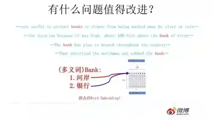 这片在Word Embedding头上笼罩了好几年的乌云是什么?是多义词问题。我们知道,多义词是自然语言中经常出现的现象,也是语言灵活性和高效性的一种体现。多义词对Word Embedding来说有什么负面影响?如上图所示,比如多义词Bank,有两个常用含义,但是Word Embedding在对bank这个单词进行编码的时候,是区分不开这两个含义的,因为它们尽管上下文环境中出现的单词不同,但是在用语言模型训练的时候,不论什么上下文的句子经过word2vec,都是预测相同的单词bank,而同一个单词占的是同一行的参数空间,这导致两种不同的上下文信息都会编码到相同的word embedding空间里去。所以word embedding无法区分多义词的不同语义,这就是它的一个比较严重的问题。