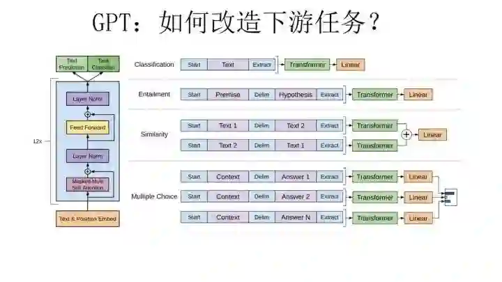 这里引入了一个新问题:对于NLP各种花样的不同任务,怎么改造才能靠近GPT的网络结构呢?