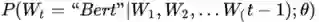 上面是闲话,闲言碎语不要讲,我们回来讲一讲NNLM的思路。先说训练过程,现在看其实很简单,见过RNN、LSTM、CNN后的你们回头再看这个网络甚至显得有些简陋。学习任务是输入某个句中单词前面句子的t-1个单词,要求网络正确预测单词Bert,即最大化: