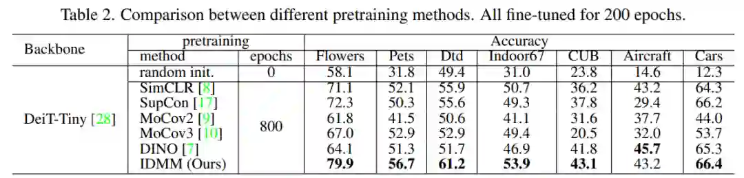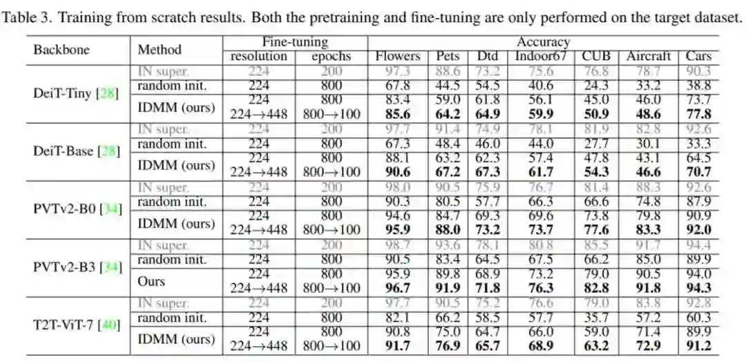 提出了用于自监督 ViT 训练的 IDMM,即使在 7 个小型数据集上对各种 ViT 主干网络从头开始训练也能获得 SOTA 结果;