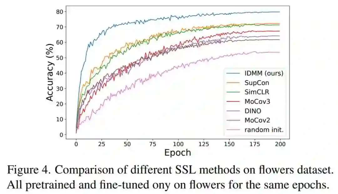 图 4:在花数据集上与不同 SSL 方法进行比较。所有模型都经过了同样 epoch 数的预训练和微调。