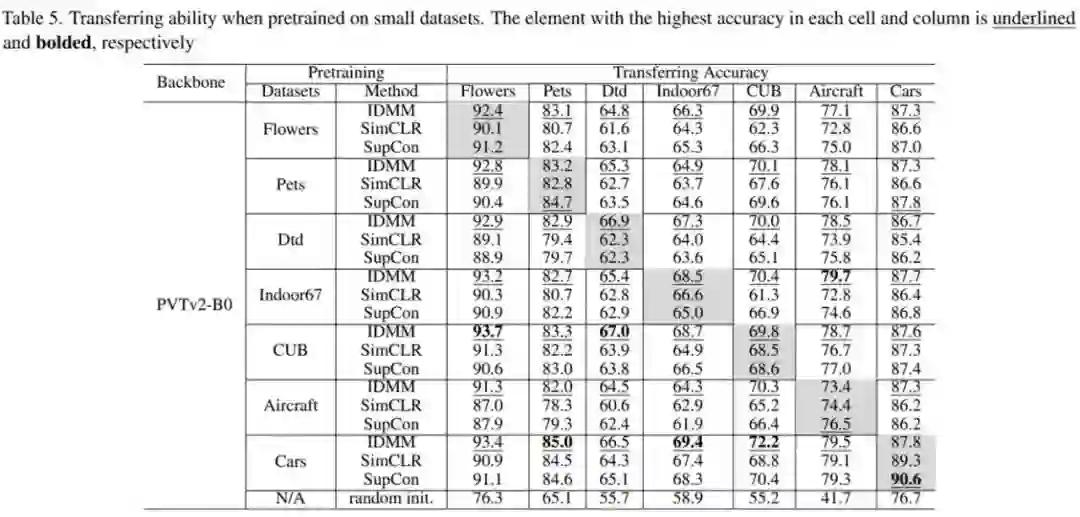 在下表 5 中,研究者评估了在不同数据集上预训练模型的迁移准确率。可以看到,即使在小型数据集上进行预训练,ViT 也具有良好的迁移能力。与 SimCLR 和 SupCon 相比,IDMM 在所有这些数据集上的迁移准确率也更高。即使预训练数据集和目标数据集不在同一个域中,研究者也可以获得非常好的结果。