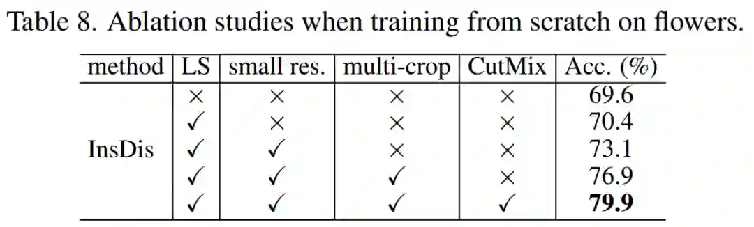 该研究将这种方法命名为带有 Multi-crop 和 CutMix 的实例判别(Instance Discrimination with Multi-crop and CutMix,IDMM)。实验结果表明,在 7 个小型数据集上从头开始训练多种 ViT 主干网络,实现了 SOTA 结果。例如,该研究在 flowers 数据集(含 2040 张图像)上从头开始训练模型,结果达到 96.7% 的准确率,这表明使用小数据集训练 ViT 是完全可以的。
