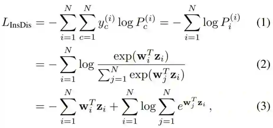 具体方法如上图所示,输入图像 x_i (i = 1, · · · , N) 被传至神经网络 f(·) 中,得到输出表征 z_i = f(x_i) ∈ R^d ,其中 N 表示实例总数。然后使用全连接层 W 进行分类,类数等于用于参数实例判别的训练图像总数 。随后将 w_j ∈ R^d 表示第 j 类的权重,W = [w_1| . . . |w_N ] ∈ R^(d×N) 包含所有 n 个类的权重。