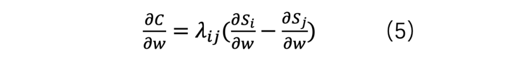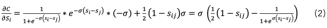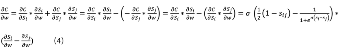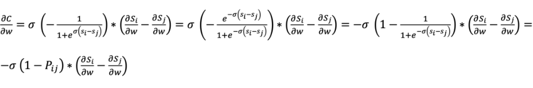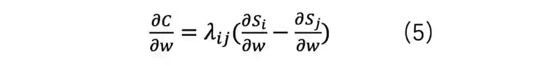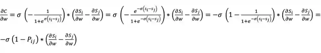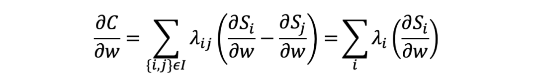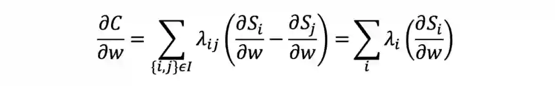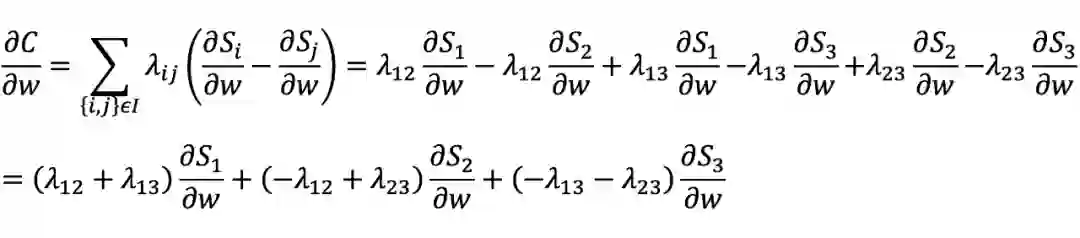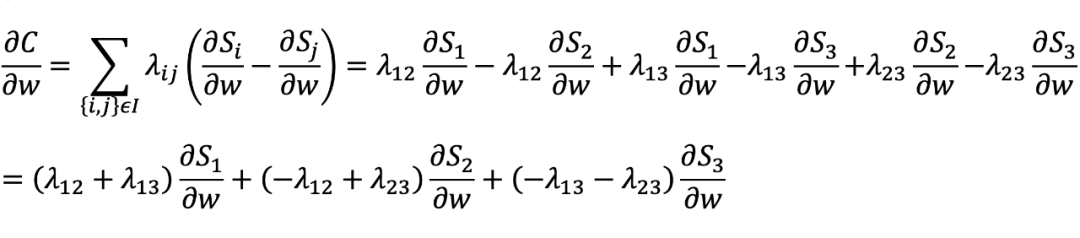 所以 pair 调换顺序产生的 loss 是完全一样的,因此我们只需要考虑 i 比 j 更相关的 pair 即可,接下来我们对模型参数求导: