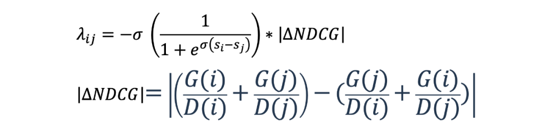 表示交换 ij 位置之后对于 NDCG 的影响,表示的是当把 j 换到 i 之后 NDCG 能增加多少。