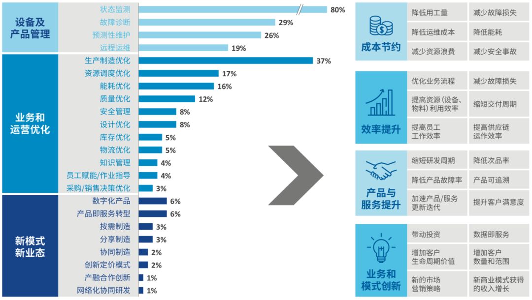 目前应用最广泛的是对生产过程进行控制和优化(37%)。应用集中在提高生产自动化、减少人工作业、自动物料选配等,部分应用能够在此基础上做到对工业知识和数据算法的融合应用。