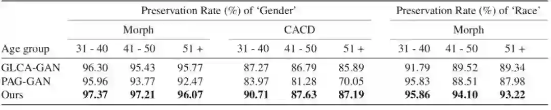 我们在两个常用数据集,Morph和CACD2000上进行了大量的实验。实验结果表明,我们提出的方法能够在保持年龄老化准确性和身份信息不变的情况下,有效提高图像变换前后人脸属性的保持率。
