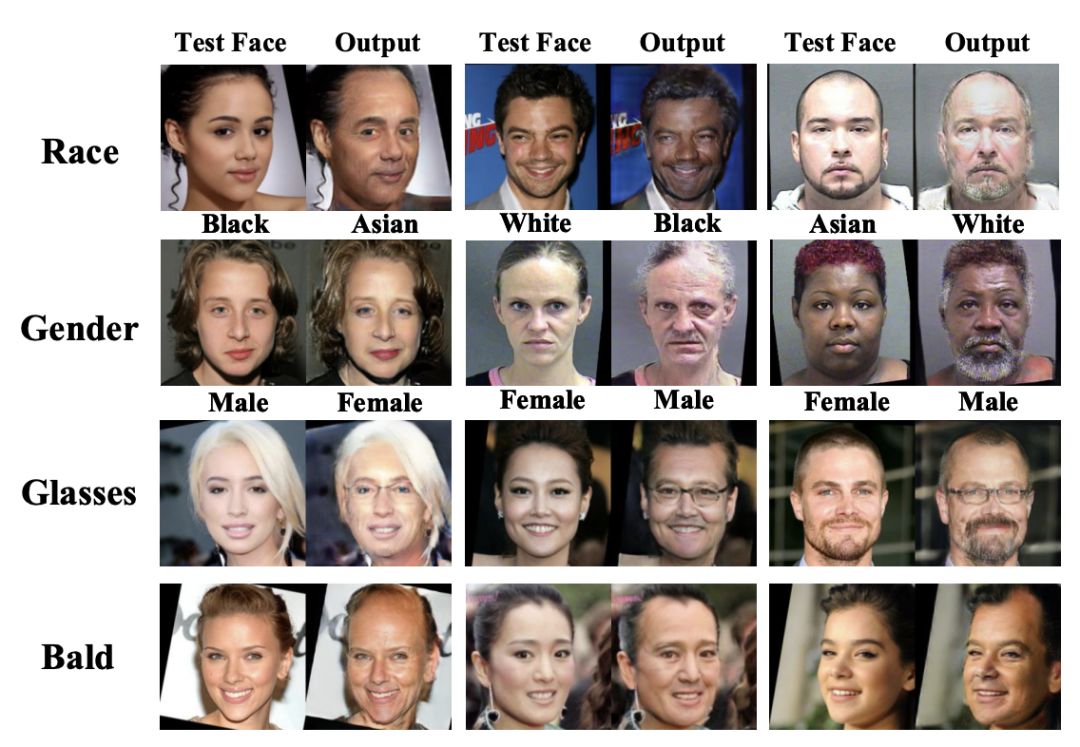 人脸年龄老化(Face Aging)指的是基于一幅给定的人脸图像,生成指定年龄的相应老化人脸图像,可用于帮助解决跨年龄人脸识别等问题。由于大规模成对的训练数据(Paired data,同一个人在不同年龄段的人脸图像)收集成本巨大,现有的人脸年龄老化算法[1, 2, 3]通常使用不成对的数据(Unpaired data)对非循环结构(non-cyclic)的GAN网络进行训练。在这种情况下,对于任意一张输入人脸图像而言,数据集中并不存在该图像在指定年龄段中的对应图像(exact aged counterpart),所以有可能会产生图像映射歧义,使得模型学习到除了年龄老化以外的变化模式,最终导致生成的老化人脸图像中的人脸属性和输入图像不一致,而这种属性的改变难以被常用的Identity Loss所避免(见图1)。