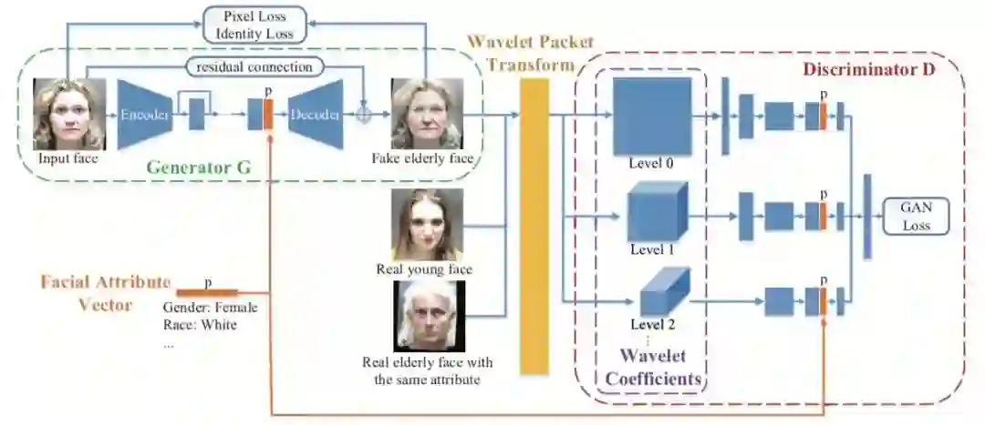 针对这个问题,自动化所智能感知与计算研究中心孙哲南、李琦、刘云帆等人提出将包含人脸属性信息的向量嵌入生成器和判别器中对模型的训练加以引导(Facial Attribute Embedding, FAE)。为了切实保证人脸属性信息能够有效地对模型所学到的图像映射进行约束,我们提出只选择和输入图像具有尽量相似人脸属性的真实年老图像作为正样本,生成年老图像和真实年轻图像均作为负样本进行对抗训练,使得判别器对年龄和人脸属性均具有判别能力,从而引导生成器合成与输入样本具有相同人脸属性的老化人脸图像。我们提出的模型框架如图2所示。
