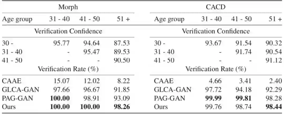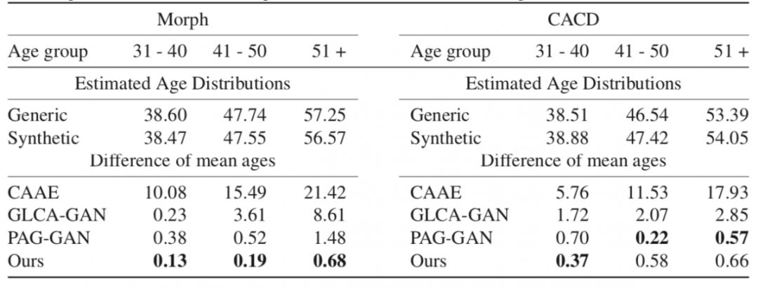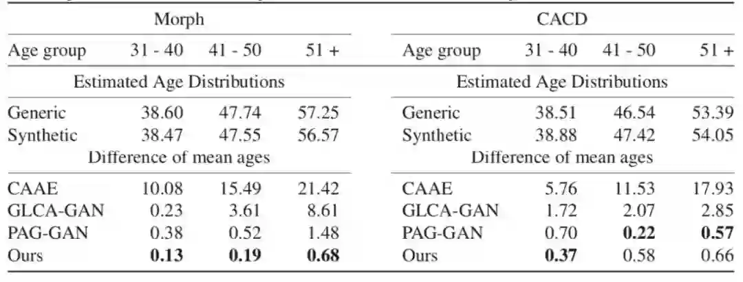 表1 Morph和CACD上的年龄老化准确性实验。为了公平起见,对于每一个年龄段而言,自然和合成的人脸图像都被送入Face++ API进行年龄估计,并以平均年龄的差作为年龄老化准确性的衡量标准。