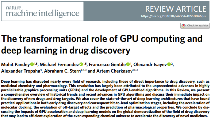 2022年3月23日,来自哥伦比亚大学的Artem Cherkasov和英伟达的Abraham C等人在Nature Machine Intelligence杂志发表文章,全面阐述了GPU计算和深度学习的历史趋势和最新进展,并讨论了它们对药物发现的直接影响。