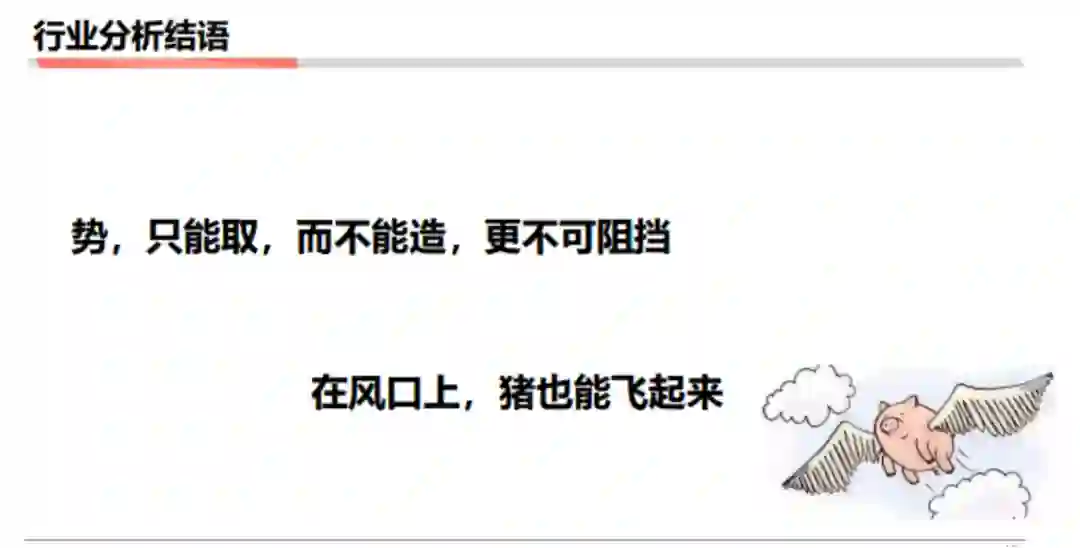 行业分析的分析技巧在此介绍完毕,行业分析的重点在通过产业角色的交互关系中去找到可利用的机会,达到借力打力事半功倍的效果,因为势,只能取,而不能造,更不可阻挡,而在在风口上,猪也能飞起来,希望大家读完这篇文章之后,都能够抓住趋势,乘势而上。
