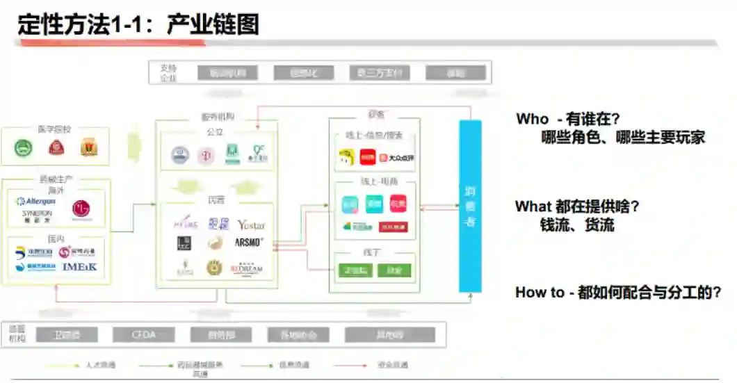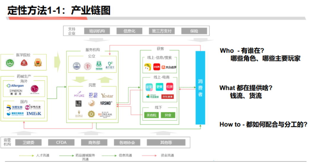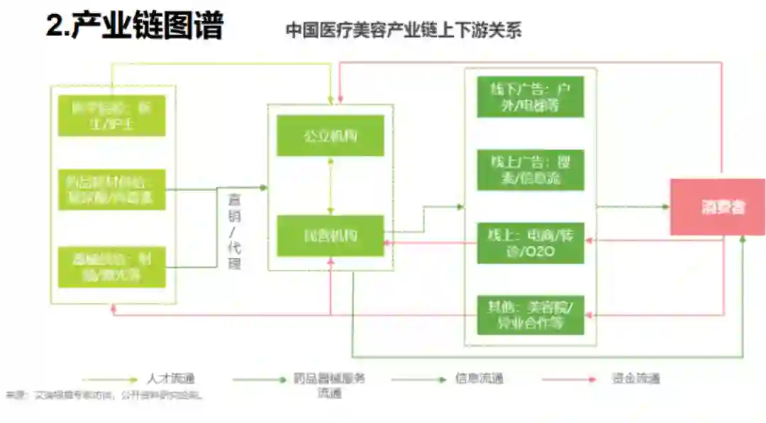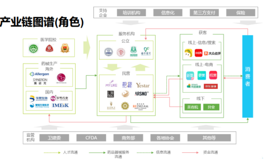 里头标示着消费者、消费者获取医美信息的各种渠道、提供医美服务的机构、给这些机构提供药品、器械与人员…等相关服务的公司。