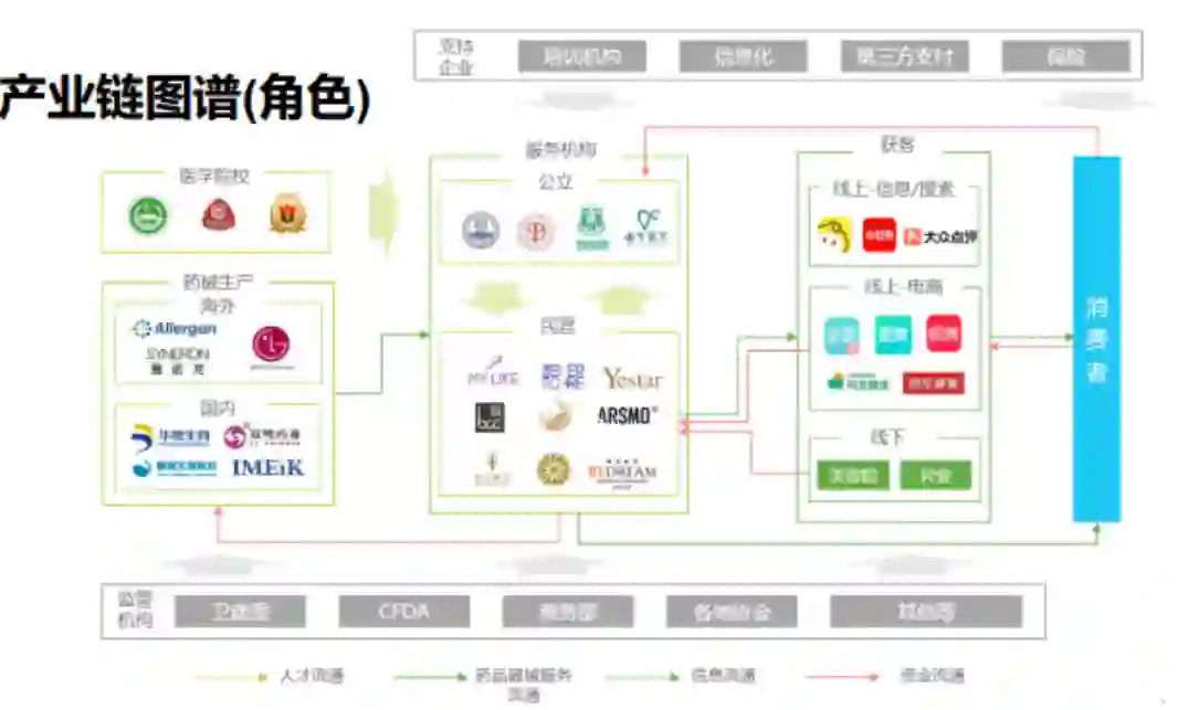 产业链地图如下所示,这是一张医美行业的产业链地图,标示医美行业提供消费者所需的产品和服务中,一共有哪些角色。