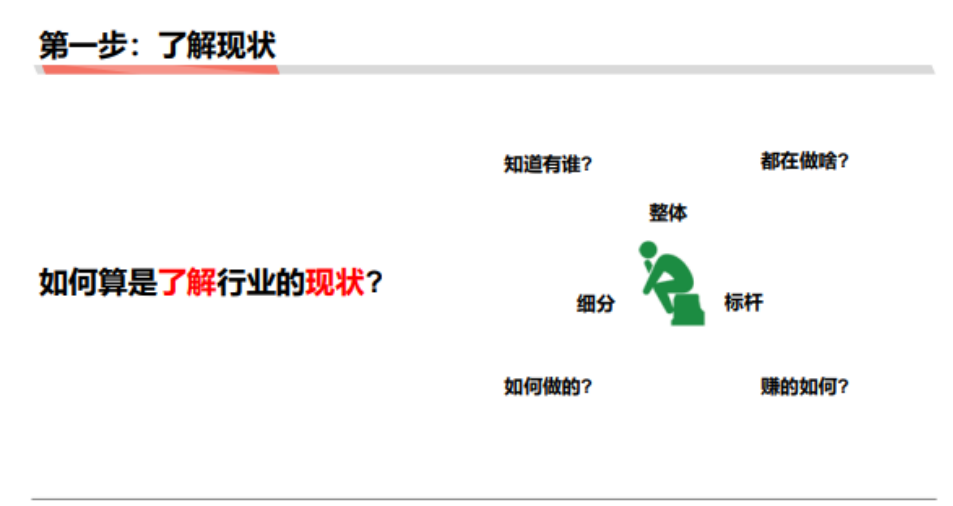 这里得先明确了解行业现状的标准是啥?其实就是了解行业的整体情况、细分情况、标杆情况,同时还了解他们分别有谁?都在做啥?如何做的?赚的如何?