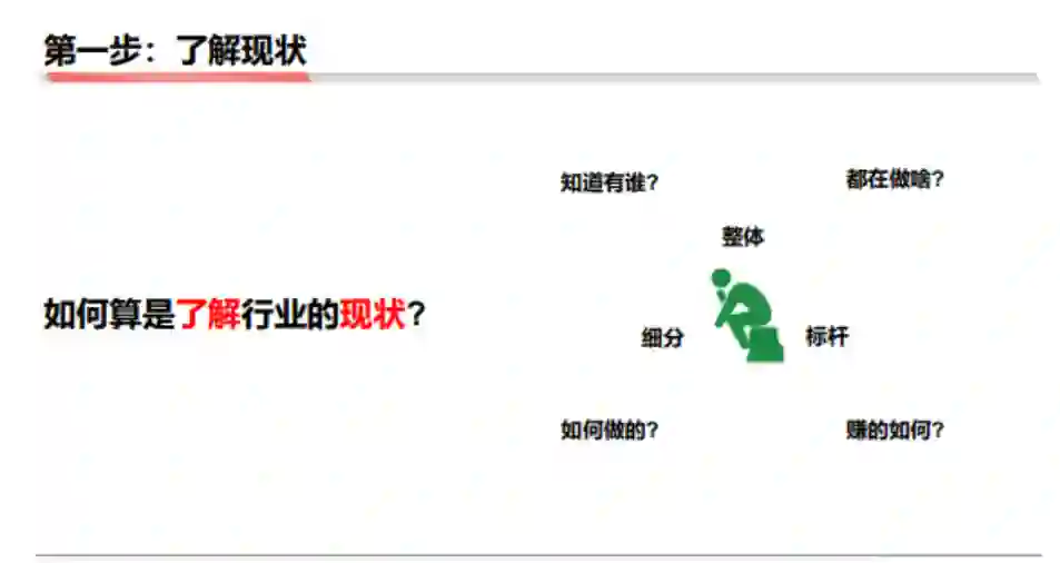 了解行业现状:也就是了解确行业是什么、规模与细分情况、有哪些人、如何运作、标杆有哪些、竞争壁垒等。