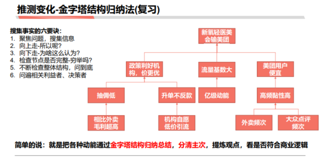 当时我先利用商业模式画布对比两个平台在医美领域的优劣势,再通过波特五力,盘点出行业各种利空利多因素,最后将其用金字塔结构进行梳理后发现。