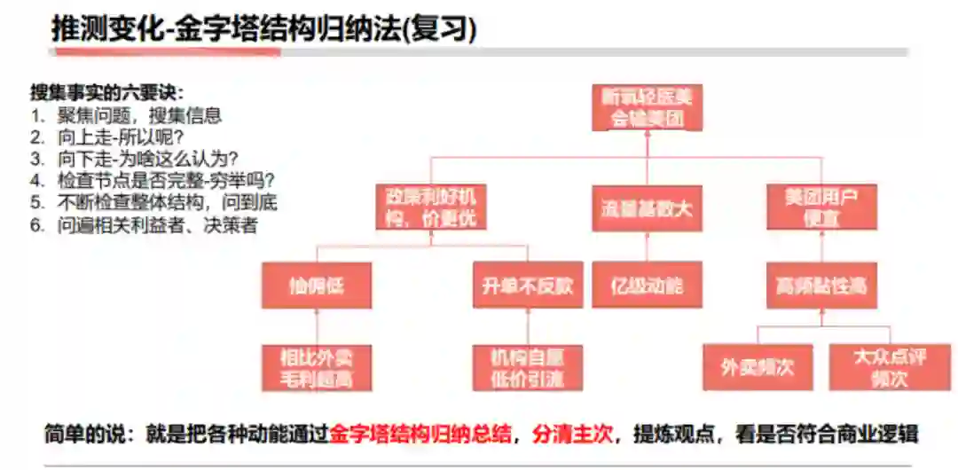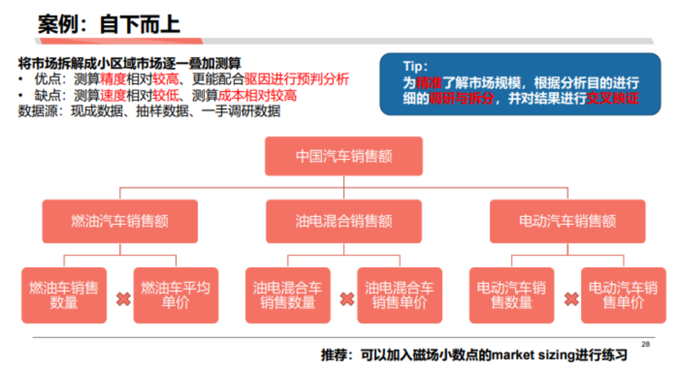 定性就是金字塔结构归纳法和优先级排序法的交叉应用,定量的技巧还是市场规模预估,只是之前预估的是现在的市场规模,这里预估的是里面的参数未来会如何变化。