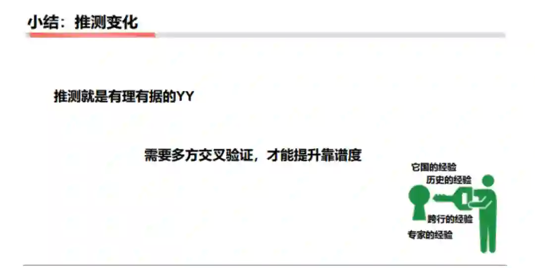 最后无论你如何推测,可能都无法确保100%的准确性,而且一定会有部分业务专家人不同意你的看法,这是正常的现象,因为确定性高的事情,大家都已经看到了,机会也不存在了。