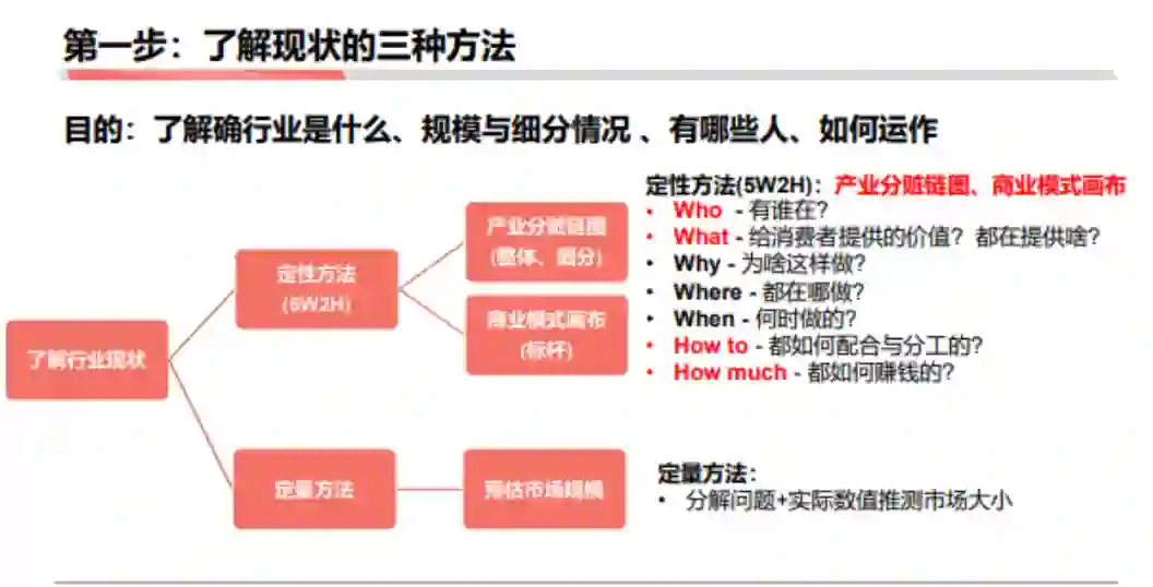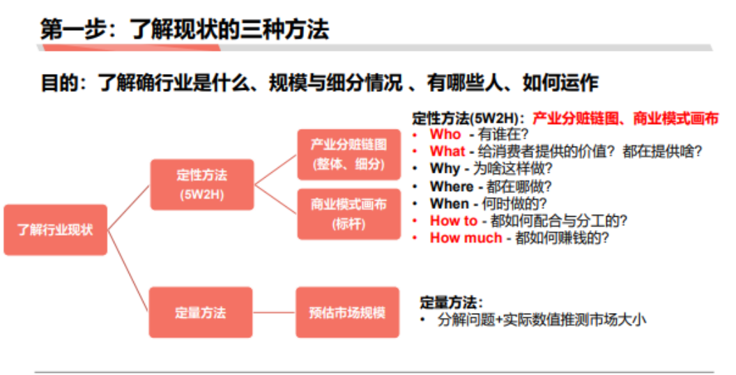 听得很复杂,但是其实通过三个方法,就能够系统并迅速的了解,首先是两个定性方法,内容核心就是文章前面提到的5W2H方法。