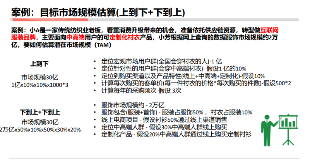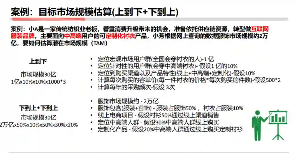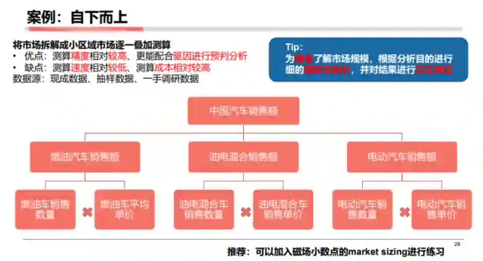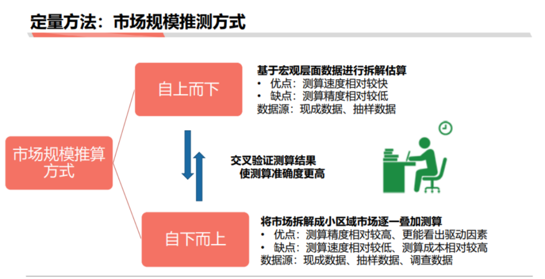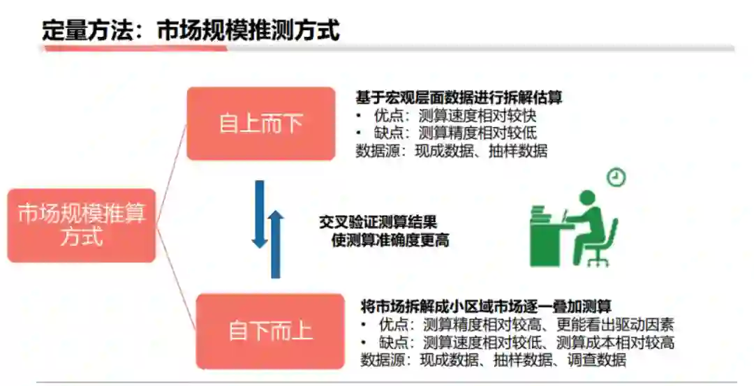 最后是定量方法,可以通过市场规模预估法实现,具体的做法是通过分解问题与收集到的一手和二手数据进行估算。