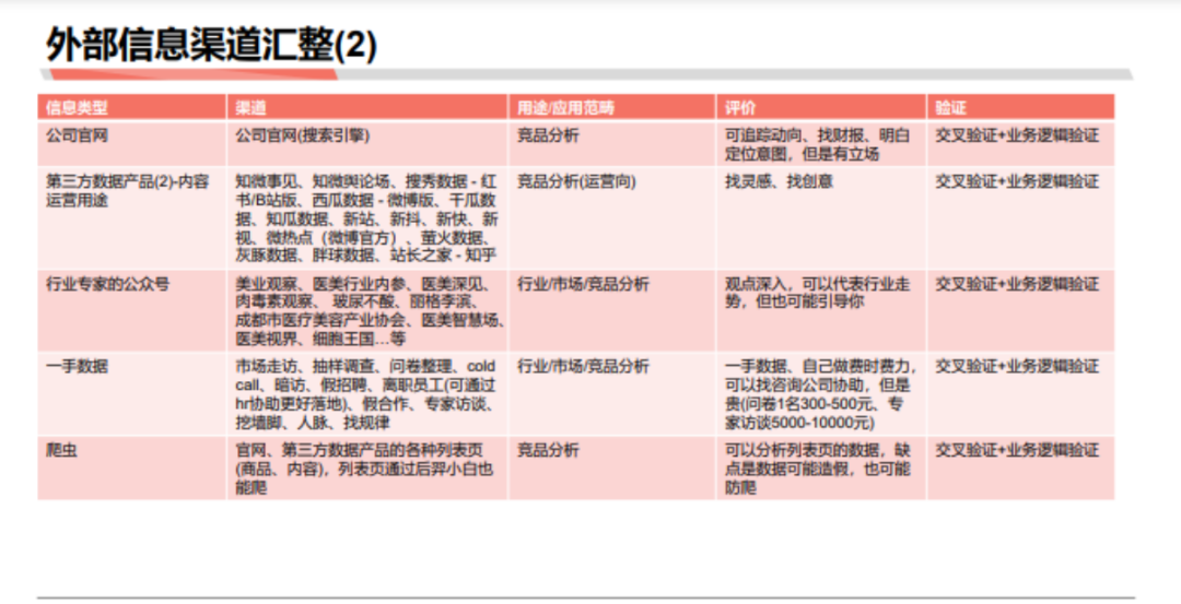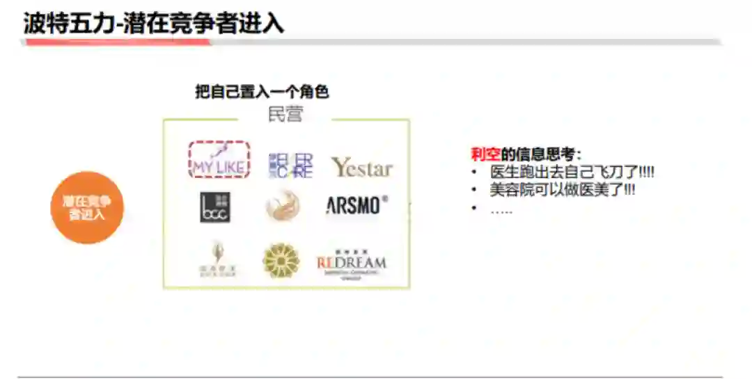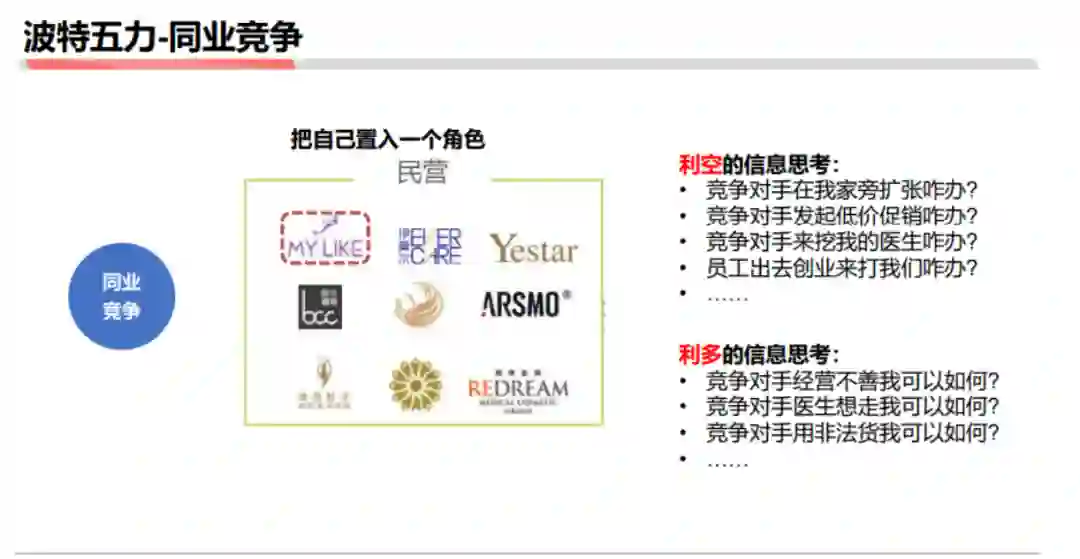 以医美行业举例,假设你是机构美莱,那你的同性竞争可能是艺星、伊美尔…等,对你的不利信息可能有竞争对手在你家旁扩张、竞争对手发起低价促销、竞争对手高价来挖你的医生、明星医生火了想自己出去创业…等。