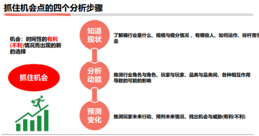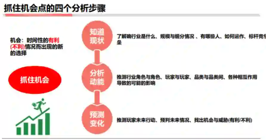 推测行业变化:推测玩家未来行动、预判未来情况、找出机会与威胁,也就是对自己有利与不利的情况。