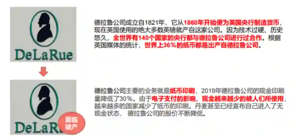 然而自2019年开始,该公司的现金印刷量降低了30%,主要是电子支付的产生和发展,使得越来越多的国家减少了纸币的印刷,德拉鲁公司的股价不断降低。