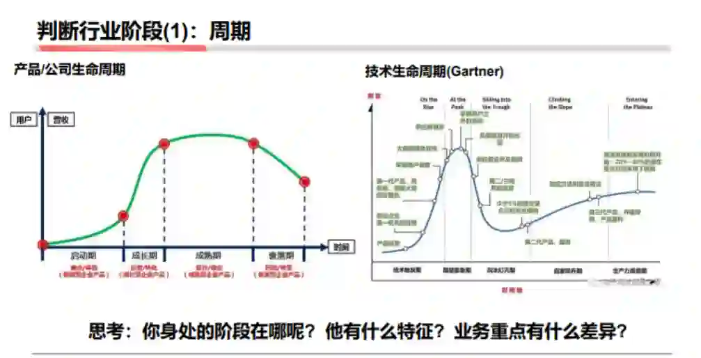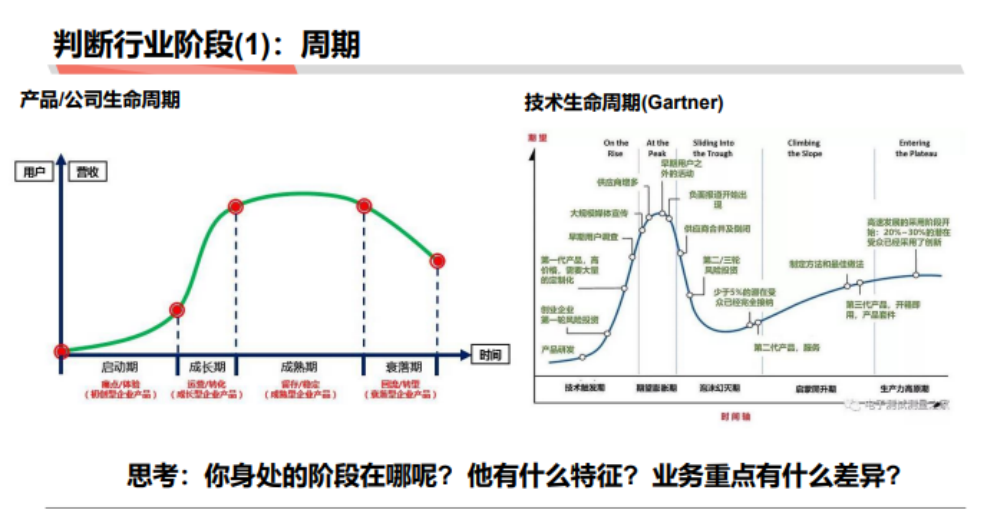 启动期更多的是考察市场研究,研究用户的需求和痛点;成长期,需要研究一下它标杆的商业模式,为“攻城略地”做参考,到成熟期、衰落期又是另外的风格。