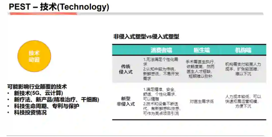 以医美行业为例,非侵入式身体塑形技术的诞生,有可能导致原本无法接受吸脂但有减肥需求的用户有了新选择,增加了医美行业市场规模的天花板,而原本使用侵入式治疗的用户可能将改用新方案来减脂,这就可能导致还没有投资此类技术更新换代的机构,失去这块的市场份额。