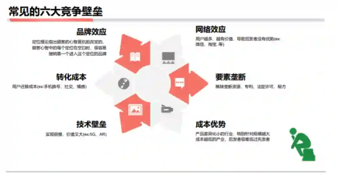 不同行业有不同的竞争壁垒,影响竞争优势较大竞争壁垒有六种: