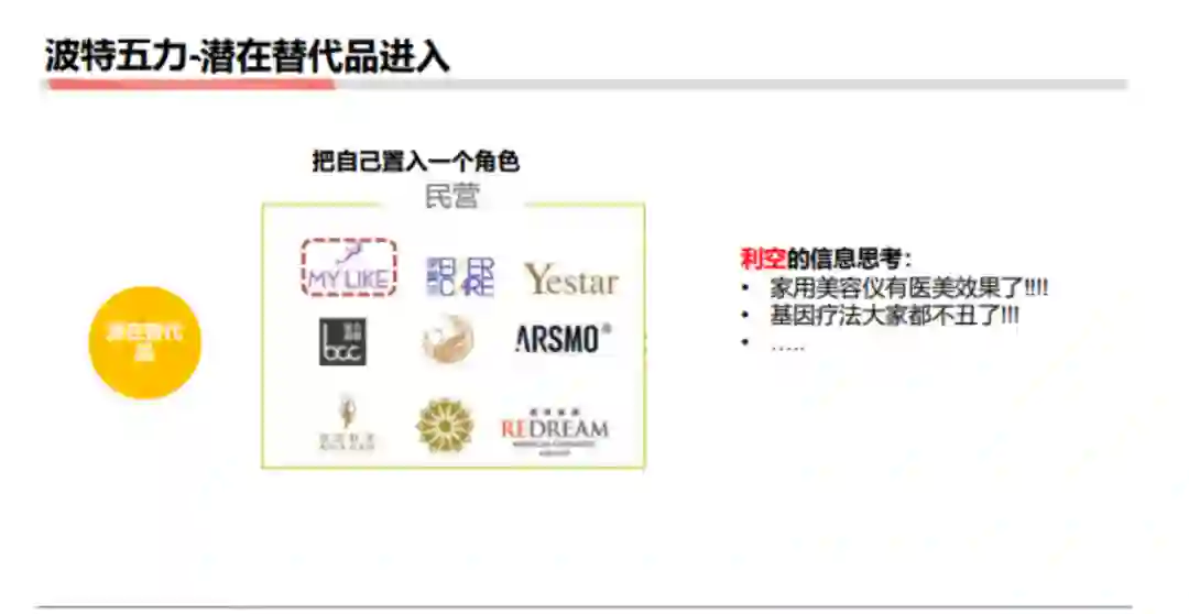 以医美行业举例,假设你是机构美莱,你的服务是藉由医生,通过手术或是非手术的方式,给客户提供变美服务,那可能的潜在替代品就可能是家用美容仪、基因疗法…等等不需要通过去医美机构就能变美的新服务。