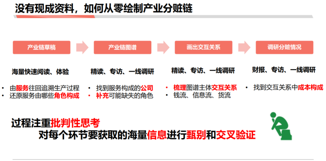 整体从零绘制产业分赃链的过程与注意要点,已为读者整理如下图,由于数据来自四面八方,绘制过程中要特别注重批判性思考,对每个环节要获取的海量信息进行甄别和交叉验证,才不容易出现错误。