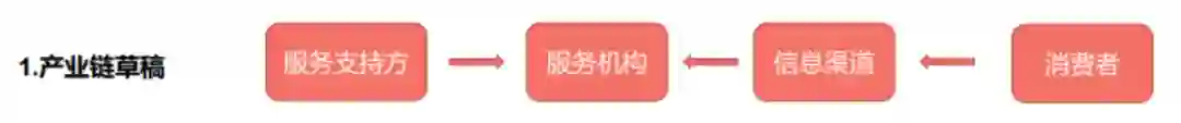 以医美行业为例,可以从消费者能从哪些管道购买医美开始,逐步向提供服务的过程还原有哪些角色存在,这时可以看到信息渠道与服务机构,从服务机构开始,再更进一步追溯机构服务的构成又有哪些服务支持方,大体把产业链的角色先画出来(如下图所示)。