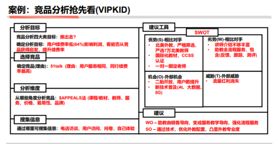 机会是二胎,信息技术普及,威胁是流量红利消失。所以通过SWOT给出的建议是: