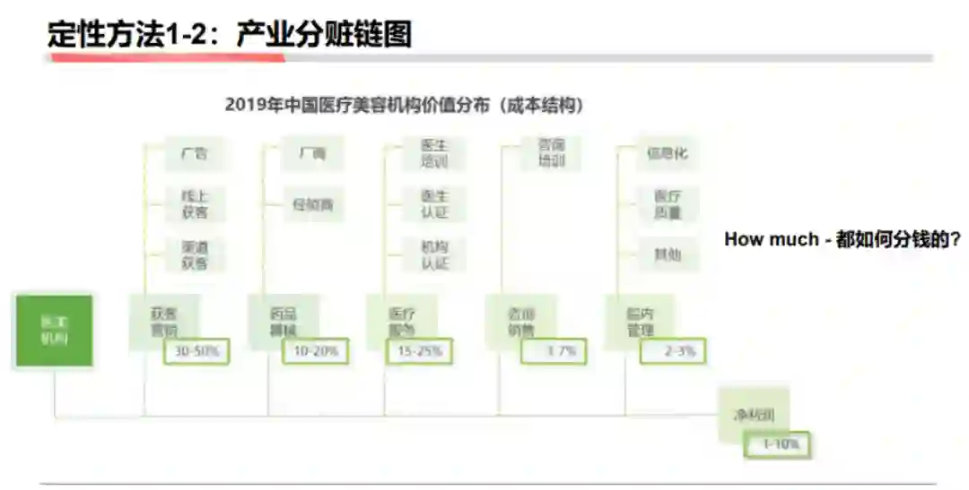 标示着医美行业中,消费者交的每一份钱,都分别是分给哪些角色赚走的,每个角色个拿多少百分比,该行业有30%-50%被下游渠道分走,药品和器械分走10%-20%,医生分走15%-25%,咨询销售分走3%-7%,机构最终分走1%-10%。