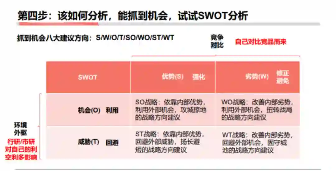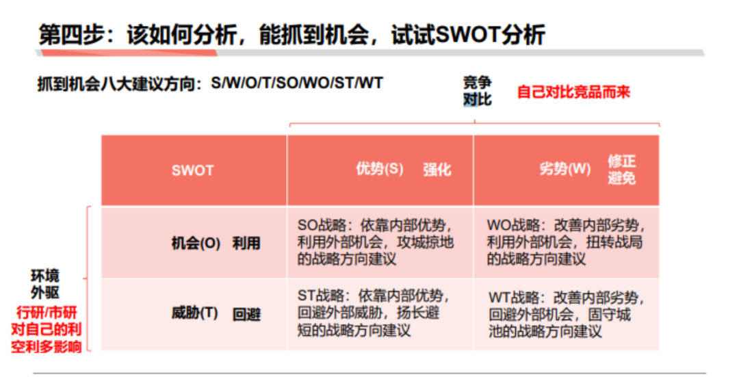 给出机会建议可以从八个角度(S/W/O/T/SO/WO/ST/WT)来进行建议。