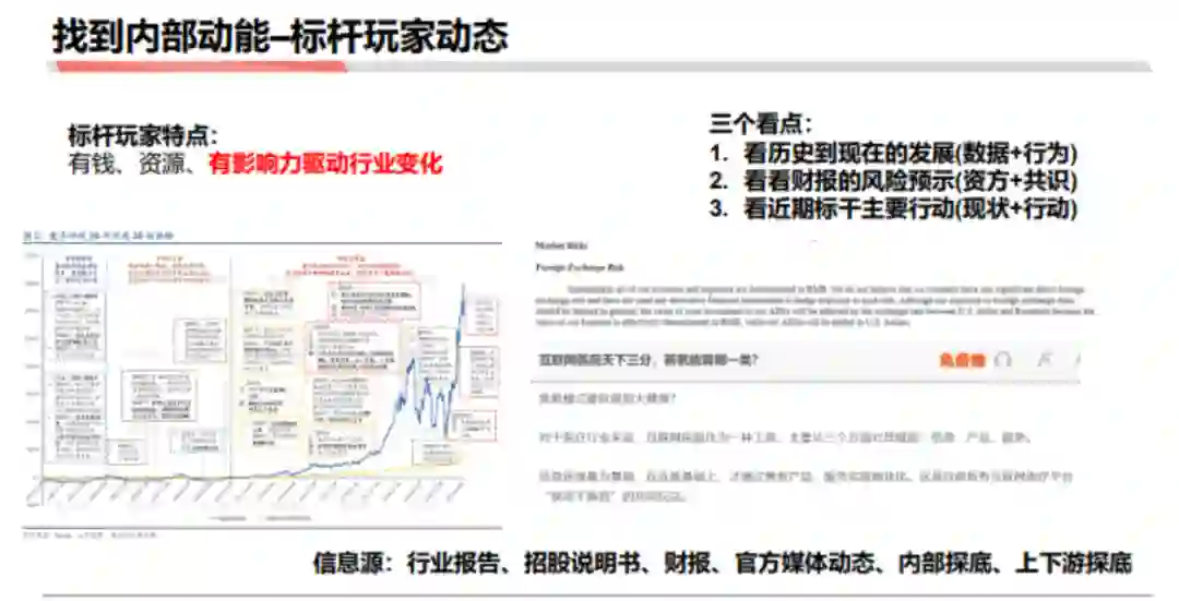 再来通过研究财报查看标杆披露给资本市场的风险提示,这里会揭露可能导致标杆业绩波动的相关风险;最后观察它的近期行动,思考这些行动可能对你的影响。相关信息可以从行业报告、招股说明书、财报、官方媒体动态、内部探底等等资料中寻找。