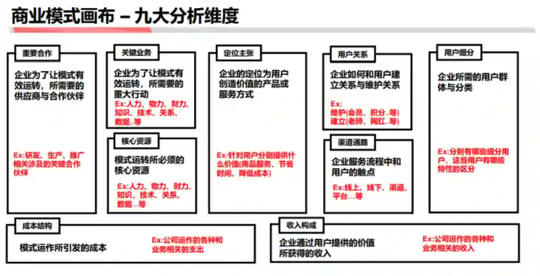 所以商业模式画布共由九个维度构成,分别是定位主张、用户细分、用户关系、渠道通路、重要合作、关键业务、核心资源、成本结构、收入构成,接下来我们来细说这几块分别代表什么?