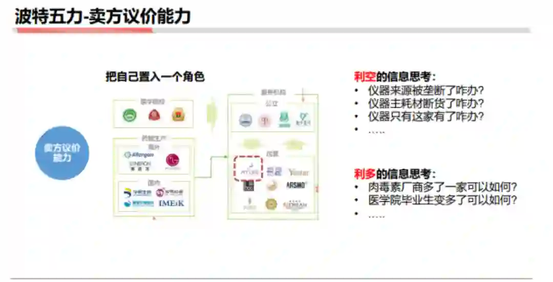 以医美行业举例,假设你是机构美莱,那你的卖方就是医学院校、药厂、械厂…等,这块卖方的议价能力越高,对你越不利,像是仪器来源被垄断、仪器主耗材断货、仪器只有这家有但是用户又需要…等。