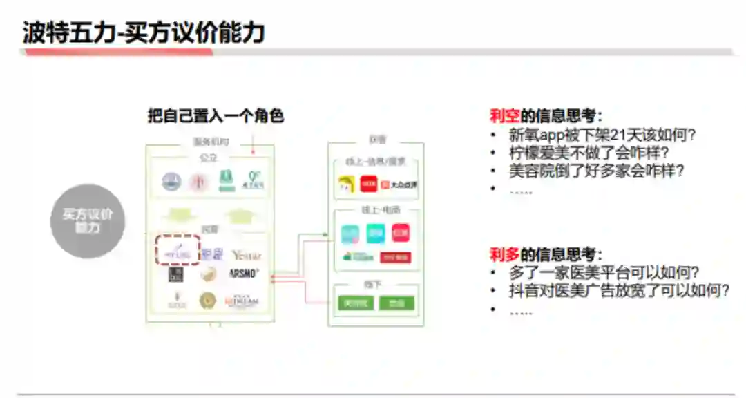 那如果你是机构,你要特别关注哪些因素会降低卖方的议价能力,例如美团也要开始涉足医美,就会导致新氧的广告议价能力降低,反之如果渠道方开始倒闭了,就会提升还在市场的渠道的议价能力。