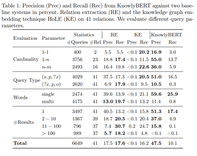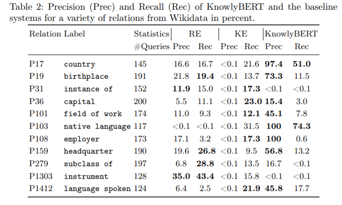表1概述了KnowlyBERT和两个基线系统的精度和召回率。最后一行中描述了的总精度和召回率值,KnowlyBERT的平均精度达到47.5%,比其他两种方法的精度高出30%以上。与关系提取基准(RE)相比,该方法极大地提高了精度,但是与RE基准的17.6%相比,方法的召回率略低,为10.1%。在表2中给出了各种关系比较的实验结果。